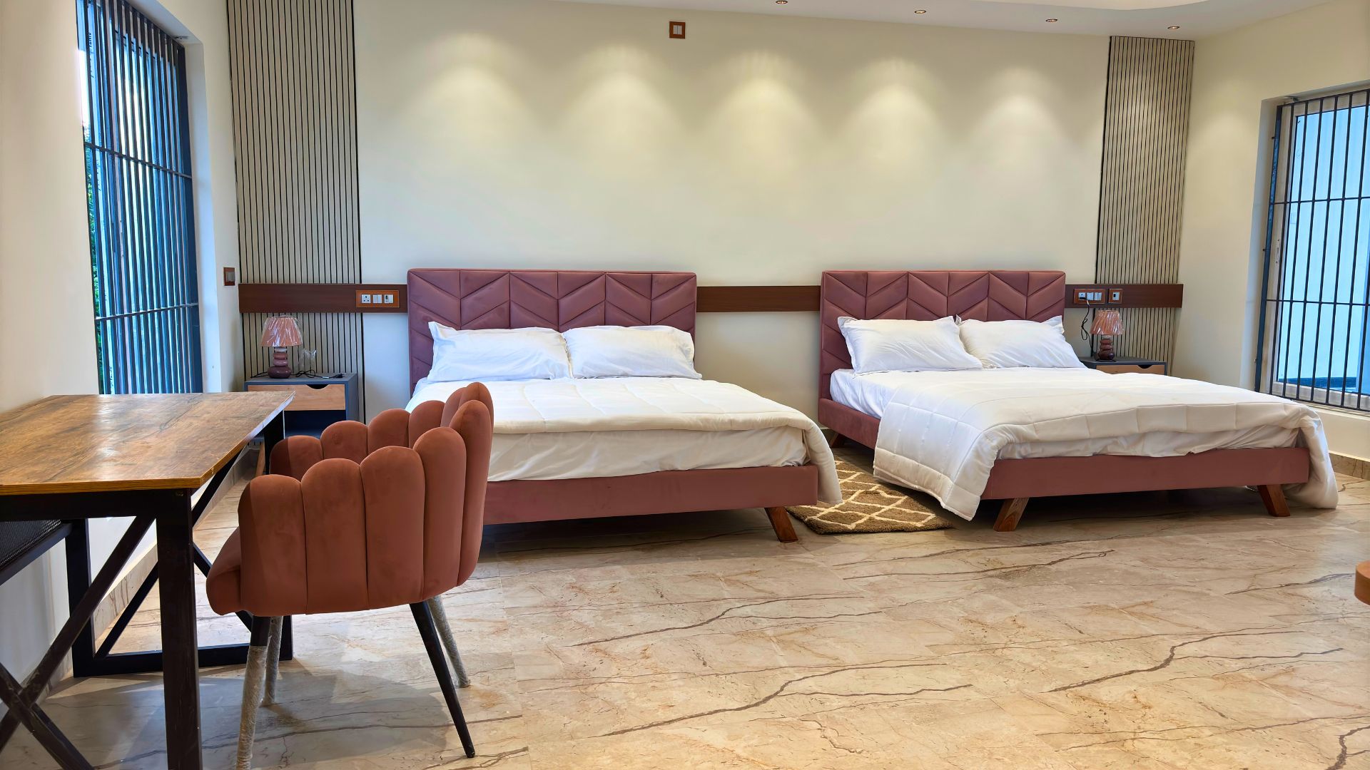A serene room inspired by natural tones and earthy charm, offering a calm and grounded stay experience.